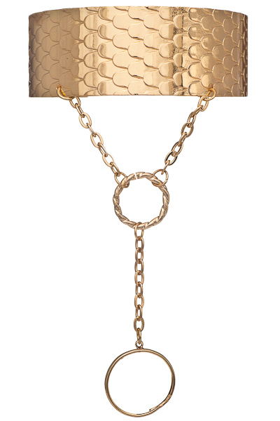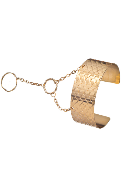 THIS CUFF BRACELET FEATURES A LINKED ADJUSTABLE RING.