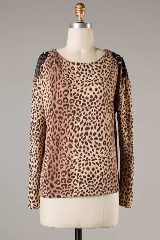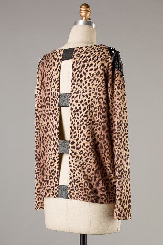 Wild animal print top with studded spikes on the shoulder and cut-outs going down the back. 65% Polyester 32% Rayon 5% Spandex Made in China